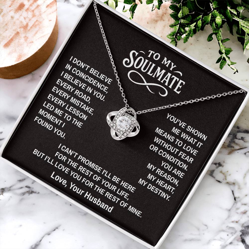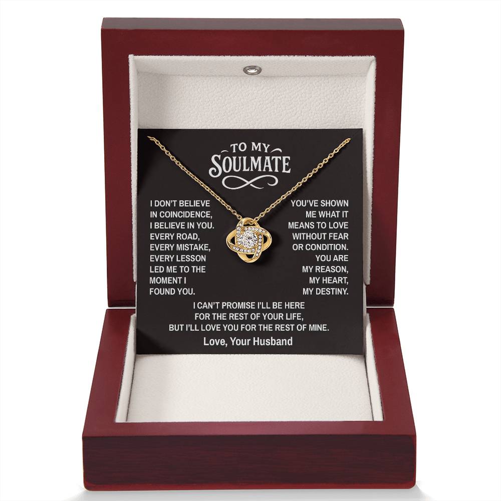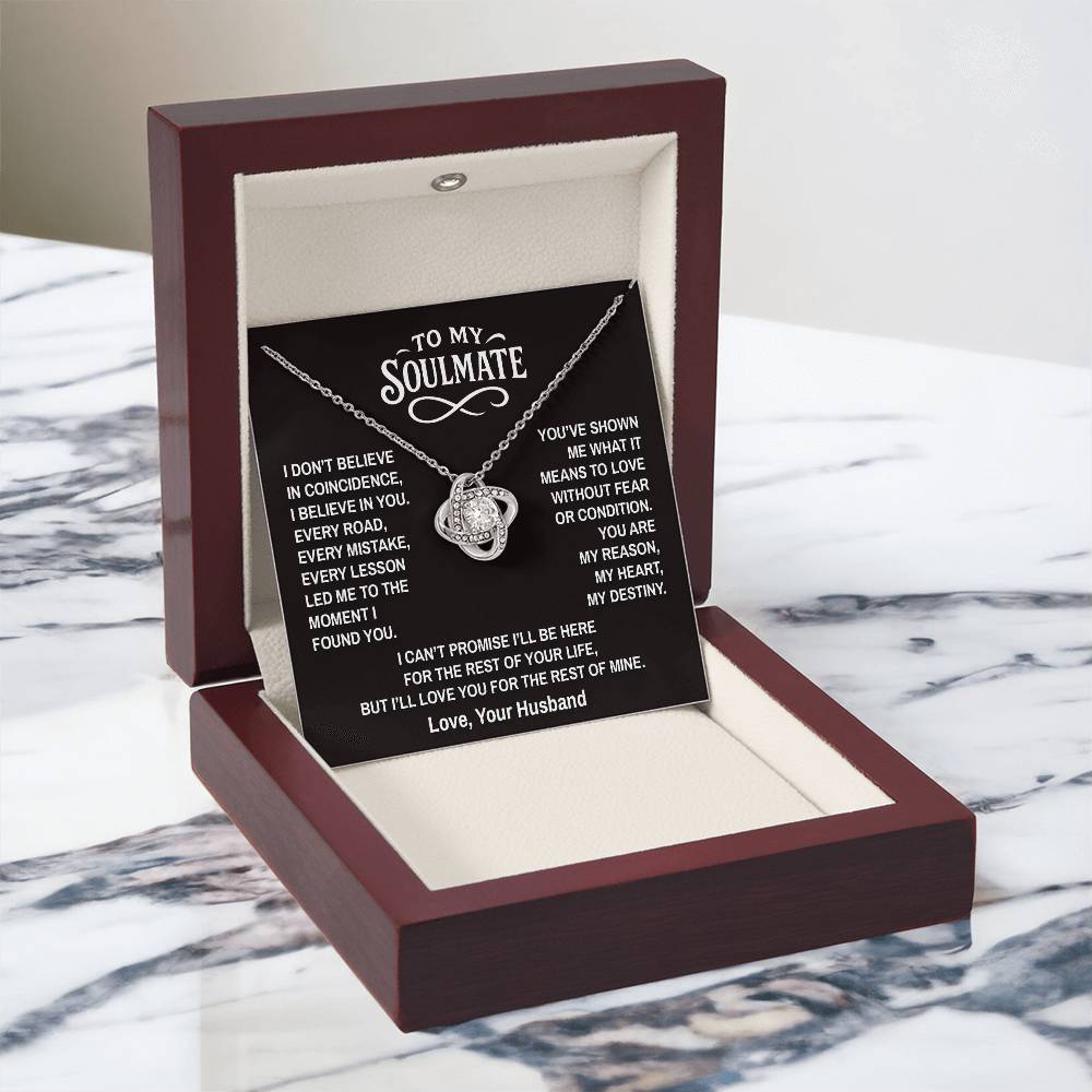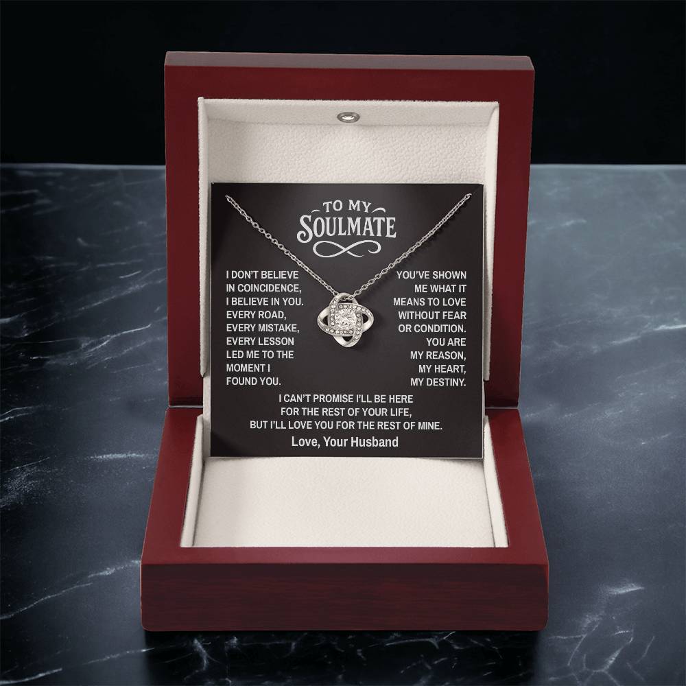 Personalized Message Card: To My Soulmate. I don’t believe in coincidence, I believe in you. Every road, every mistake, every lesson led me to the moment I found you. You’ve shown me what it means to love without fear or condition. You are my reason, my heart, my destiny. I can’t promise I’ll be here for the rest of your life, but I’ll love you for the rest of mine. Love, Your Husband