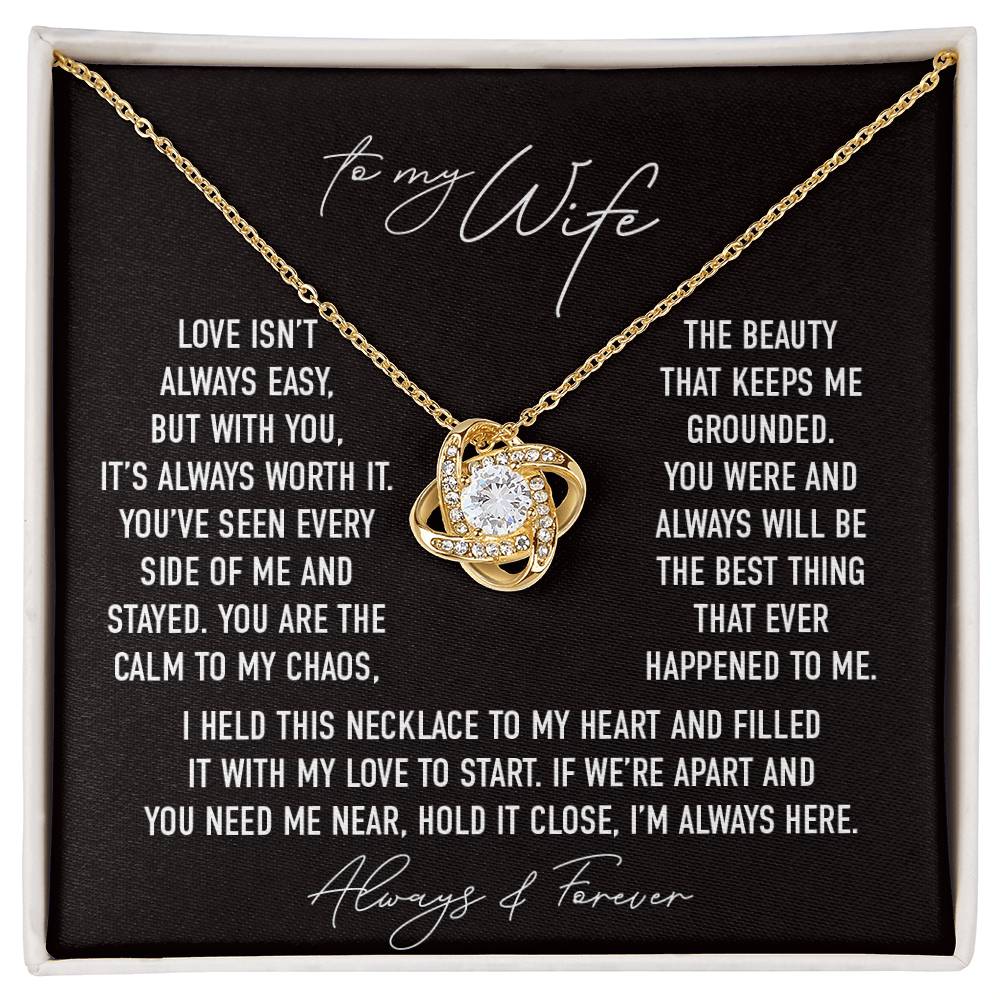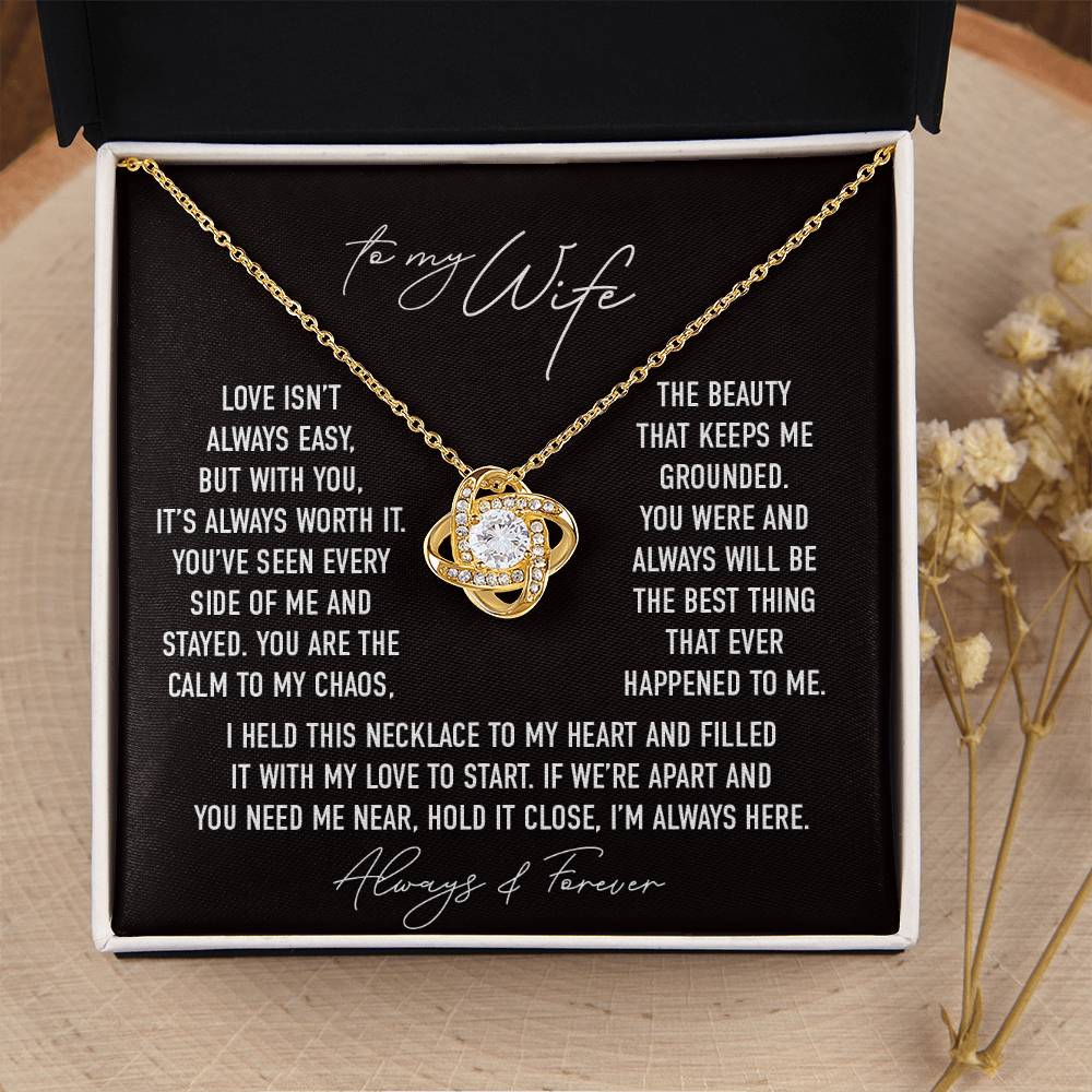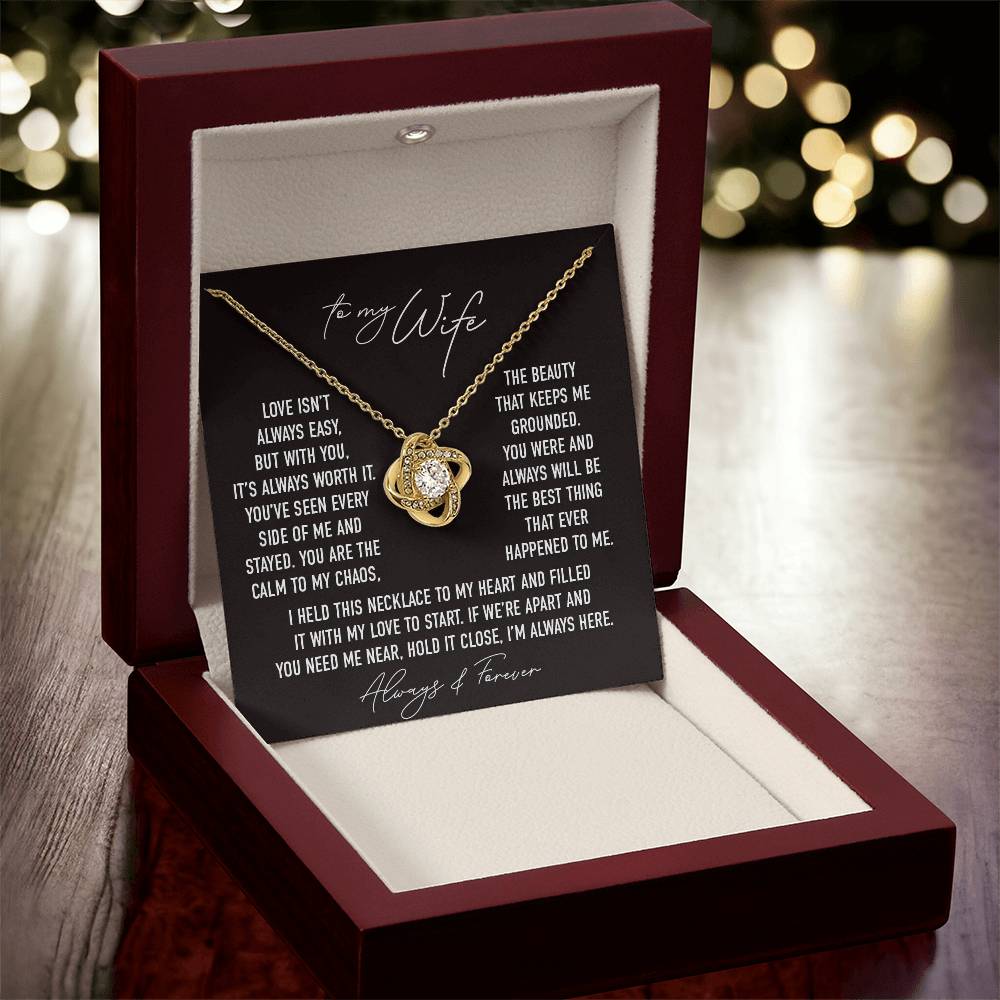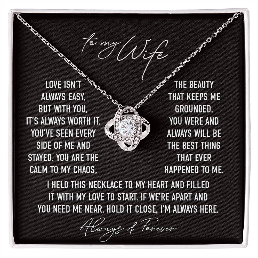 Personalized Message Card: To My Wife. Love isn’t always easy, but with you, it’s always worth it. You’ve seen every side of me and stayed. You are the calm to my chaos, the beauty that keeps me grounded. You were and always will be the best thing that ever happened to me. I held this necklace to my heart and filled it with my love to start. If we’re apart and you need me near, hold it close, I’m always here. Always & Forever