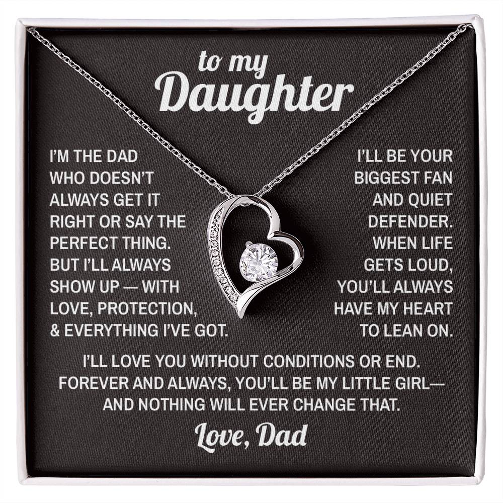 Personalized Message Card: To My Daughter. I'm the dad who doesn’t always get it right or say the perfect thing. But I’ll always show up — with love, protection, and everything I’ve got. I’ll be your biggest fan and quiet defender. When life gets loud, you’ll always have my heart to lean on. I’ll love you without conditions or end. Forever and always, you’ll be my little girl — and nothing will ever change that. Love, Dad.