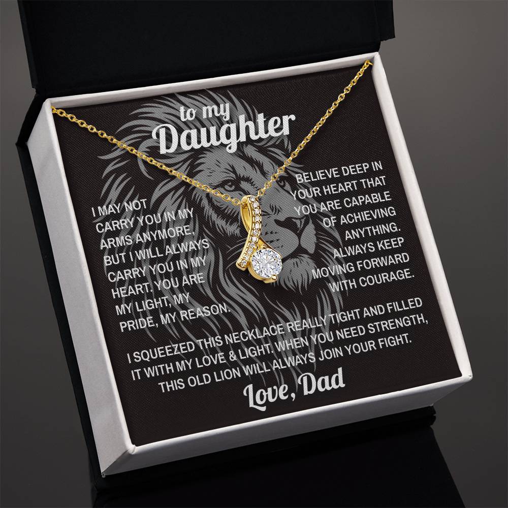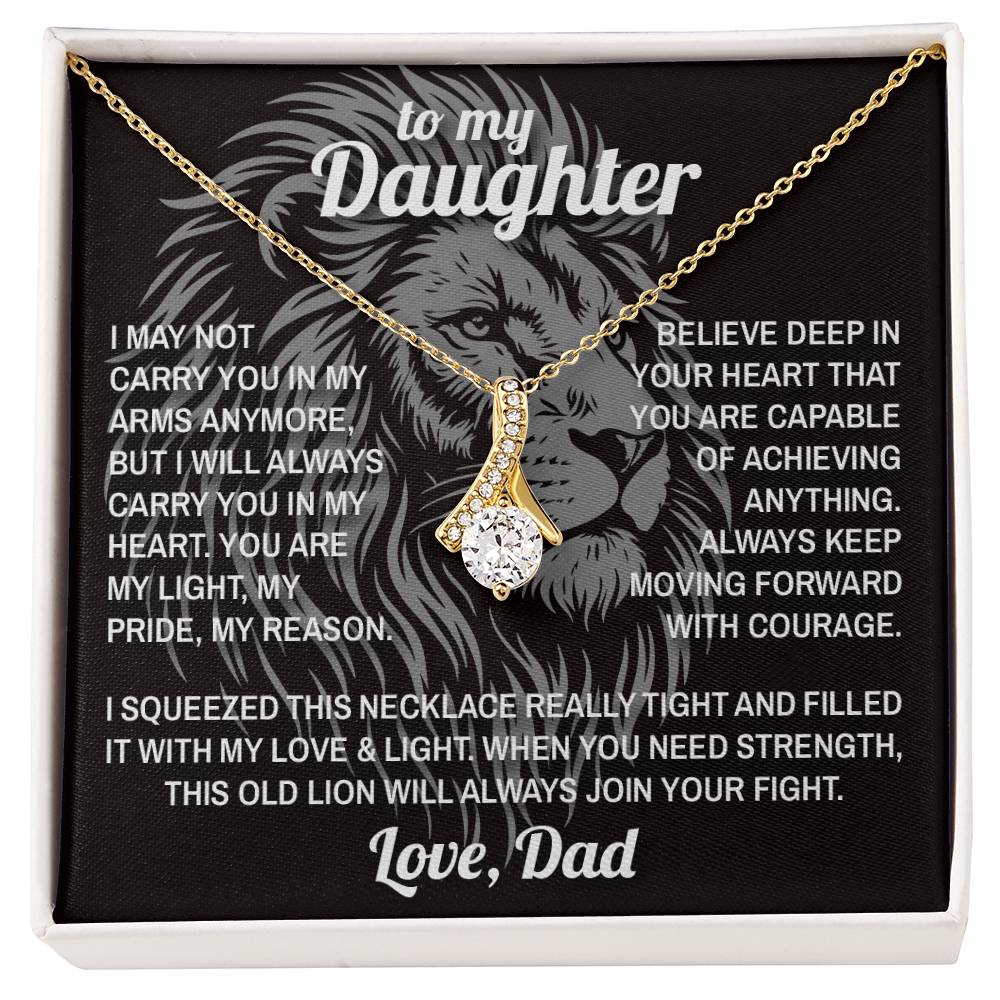 Personalized Message Card: To My Daughter - I may not carry you in my arms anymore, but I will always carry you in my heart. You are my light, my pride, my reason. Believe deep in your heart that you are capable of achieving anything. Always keep moving forward with courage. I squeezed this necklace really tight and filled it with my love and light. When you need strength, this old lion will always join your fight. Love, Dad