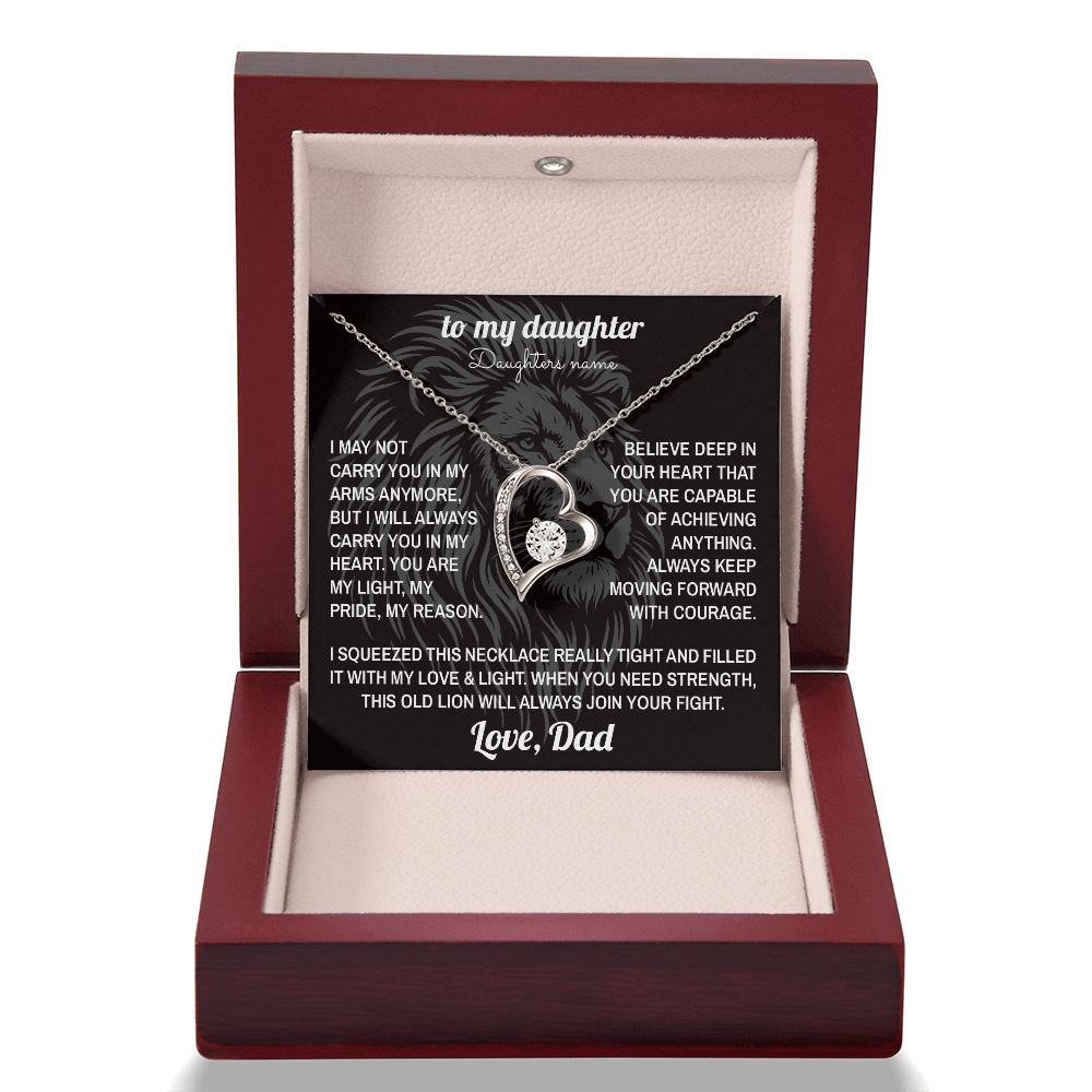 Personalized Message Card: To My Daughter (Daughter's name here) - I may not carry you in my arms anymore, but I will always carry you in my heart. You are my light, my pride, my reason. Believe deep in your heart that you are capable of achieving anything. Always keep moving forward with courage. I squeezed this necklace really tight and filled it with my love and light. When you need strength, this old lion will always join your fight. Love, Dad