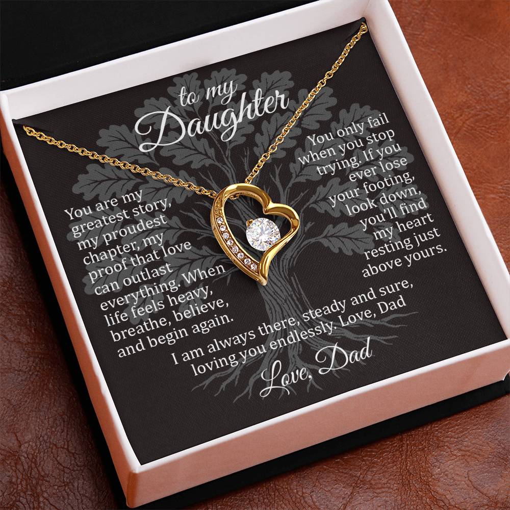 Personalized Message Card: To My Daughter - You are my greatest story, my proudest chapter, my proof that love can outlast everything. When life feels heavy, breathe, believe, and begin again. You only fail when you stop trying. If you ever lose your footing, look down, you’ll find my heart resting just above yours. I am always there, steady and sure, loving you endlessly. Love, Dad.