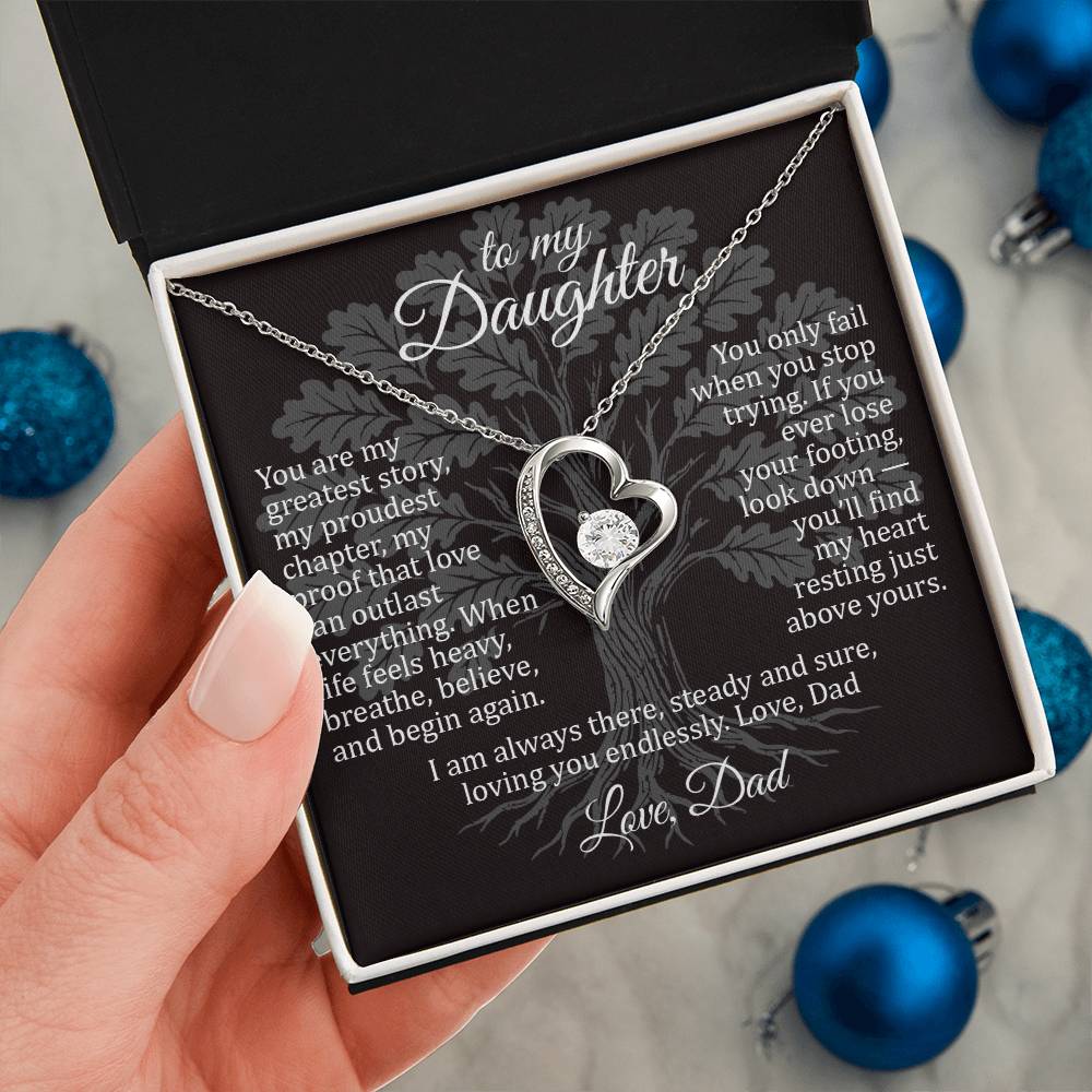 Personalized Message Card: To My Daughter. You are my greatest story, my proudest chapter, my proof that love can outlast everything. When life feels heavy, breathe, believe, and begin again. You only fail when you stop trying. If you ever lose your footing, look down — you’ll find my heart resting just above yours. I am always there, steady and sure, loving you endlessly. Love, Dad.