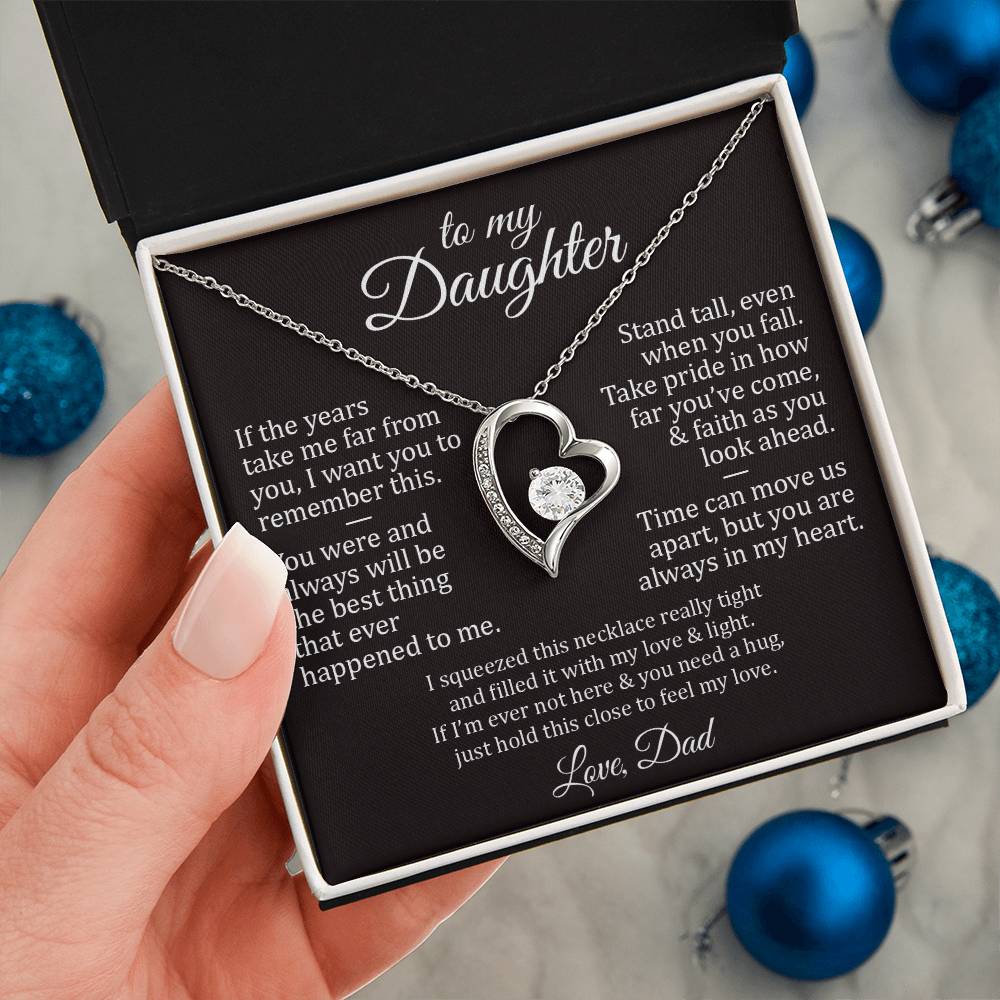 Personalized Message Card: To My Daughter. If the years take me far from you, I want you to remember this. You were and always will be the best thing that ever happened to me. Stand tall, even when you fall. Take pride in how far you’ve come, and faith as you look ahead. Time can move us apart, but you are always in my heart. I squeezed this necklace really tight and filled it with my love and light. If I’m ever not here and you need a hug, just hold this close to feel my love. Love, Dad.