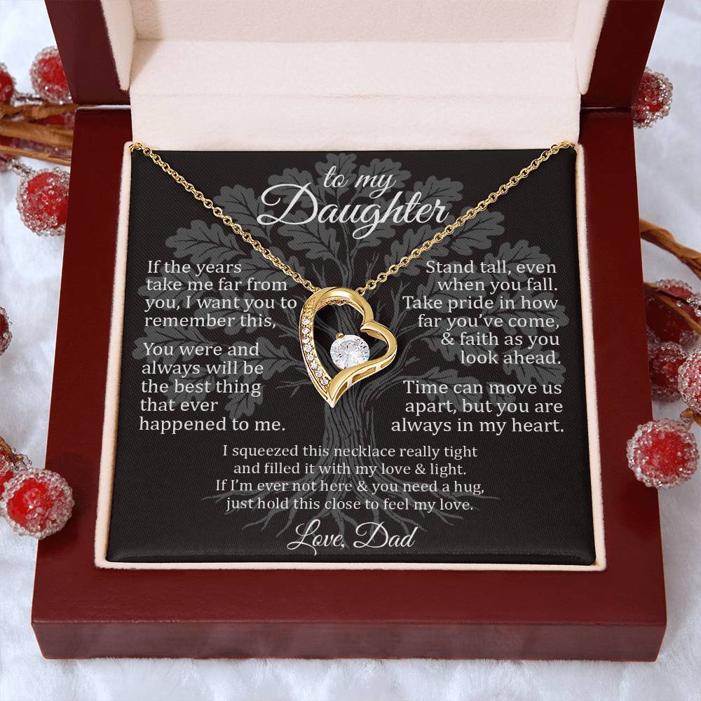 Personalized Message Card: To My Daughter - If the years take me far from you, I want you to remember this, you were and always will be the best thing that ever happened to me. Stand tall, even when you fall. Take pride in how far you’ve come, and faith as you look ahead. Time can move us apart, but you are always in my heart. I squeezed this necklace really tight and filled it with my love and light. If I’m ever not here and you need a hug, just hold this close to feel my love. Love, Dad