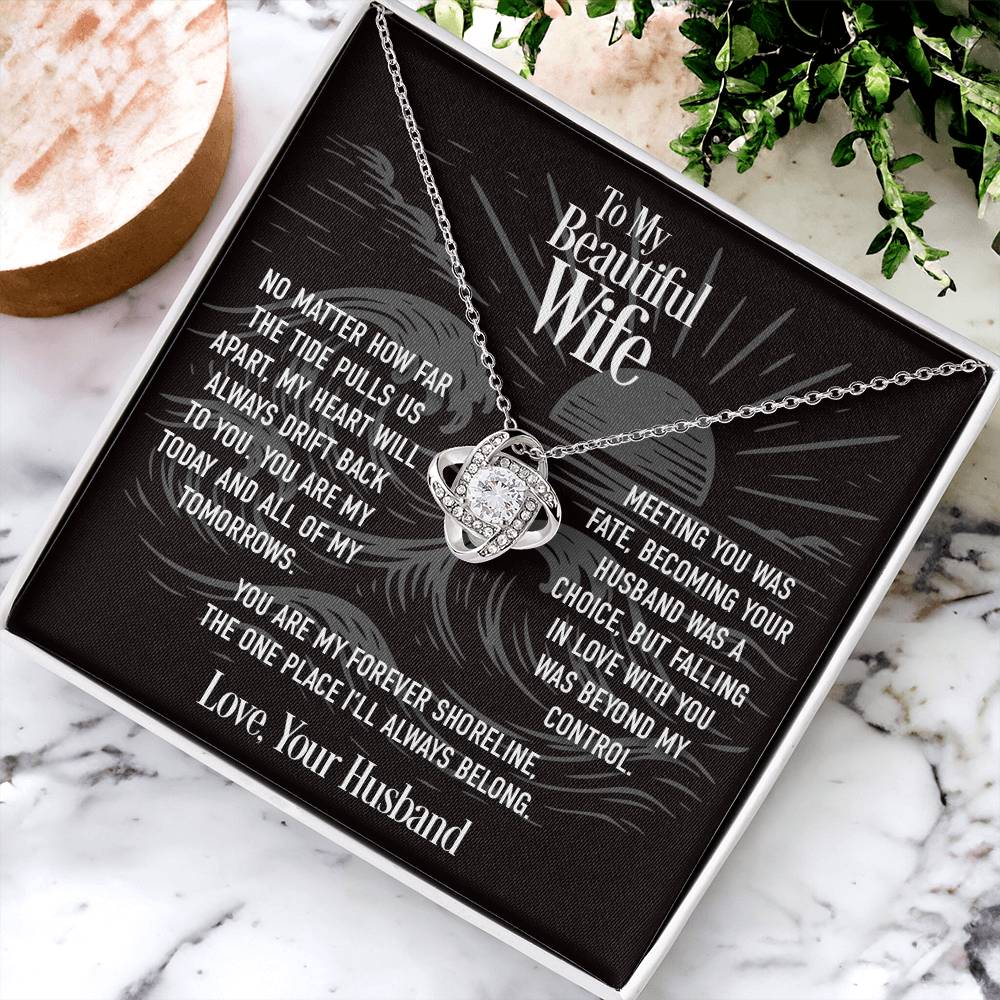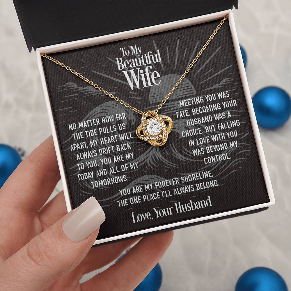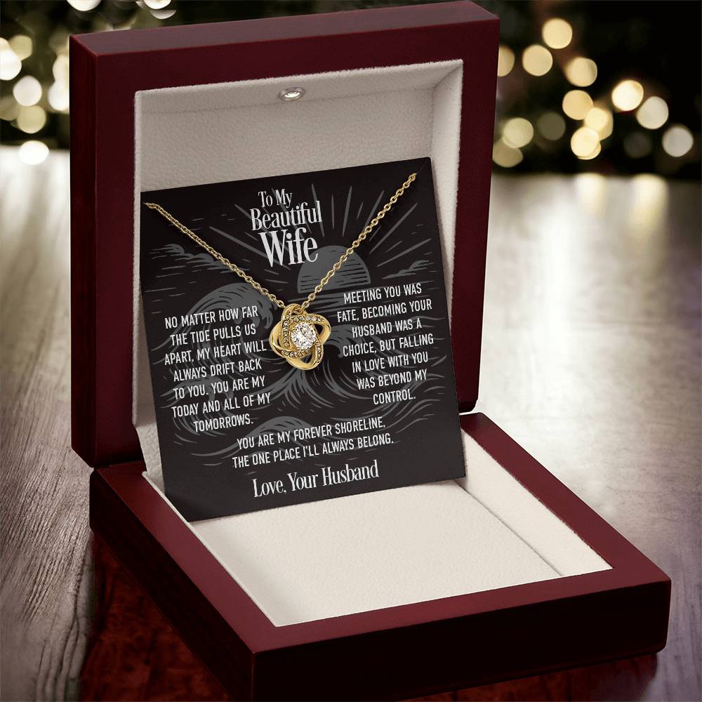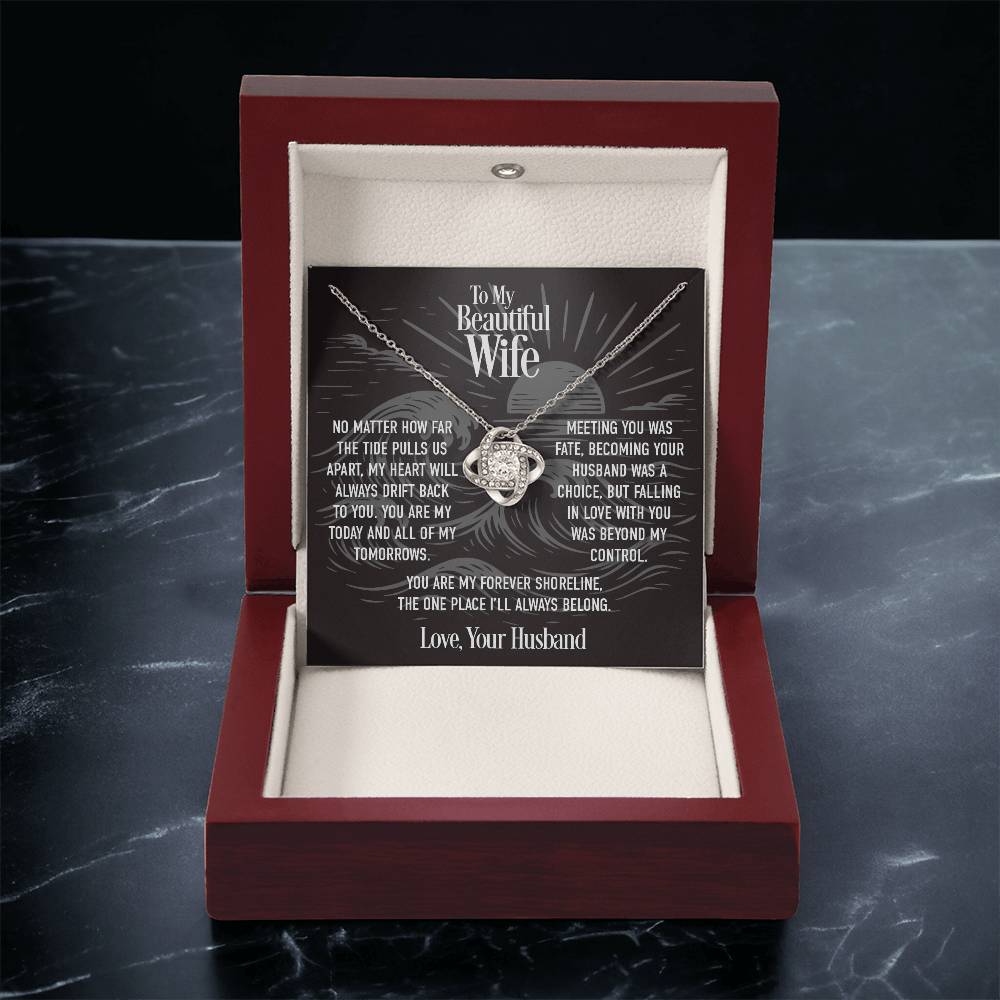 Personalized Message Card: To My Beautiful Wife. No matter how far the tide pulls us apart, my heart will always drift back to you. You are my today and all of my tomorrows. Meeting you was fate, becoming your husband was a choice, but falling in love with you was beyond my control. You are my forever shoreline, the one place I’ll always belong. Love, Your Husband